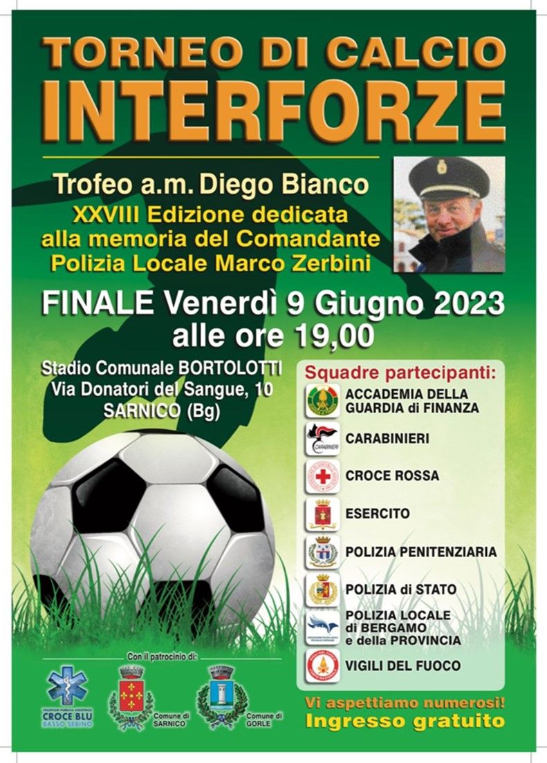 vi invitiamo tutti ad assistere alla Finale del XXVIII Torneo di Calcio Interforze “Trofeo a.m. Diego Bianco” dedicato alla memoria del collega Comandante della Polizia Locale Marco Zerbini.