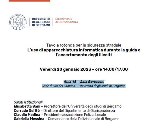 il Dipartimento di Giurisprudenza dell’Università degli Studi di Bergamo, in collaborazione con l’Associazione di Polizia Locale della provincia di Bergamo, è lieta di presentarvi la Tavola rotonda sul tema: