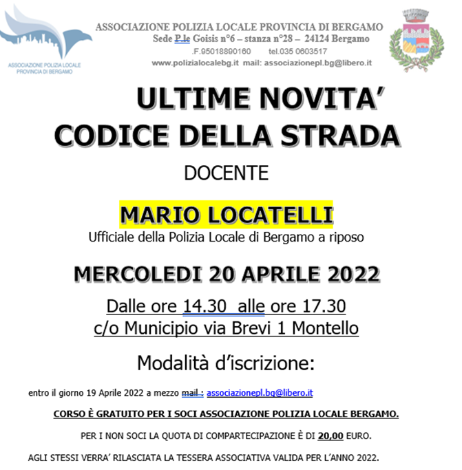 l’Associazione di Polizia Locale della provincia di Bergamo è lieta di invitarvi alla giornata formativa sulle novità del CdS per il giorno